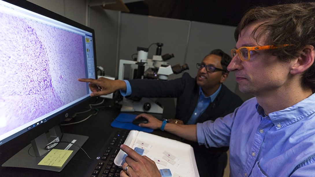 "Cancer cells in kids with DIPG are proliferating so fast, they're virtually unstoppable," says Sriram Venneti, M.D., Ph.D., pictured above with Koschmann, a pathologist at Michigan Medicine. Venneti and his team, in collaboration with colleagues at Stanford University, hope they can change that.
