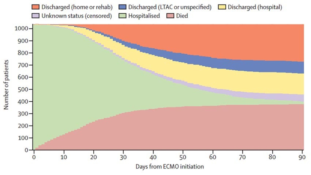 As of August 5, 380 of the patients in the study had died in the hospital, more than 80% of them within 24 hours of a proactive decision to discontinue ECMO care because of a poor prognosis. Of the remaining patients 57% had gone home or to a rehabilitation center (311 patients); had been discharged to another hospital or a long-term acute care center (277 patients). The rest were still in the hospital but had reached 90 days after the start of ECMO.