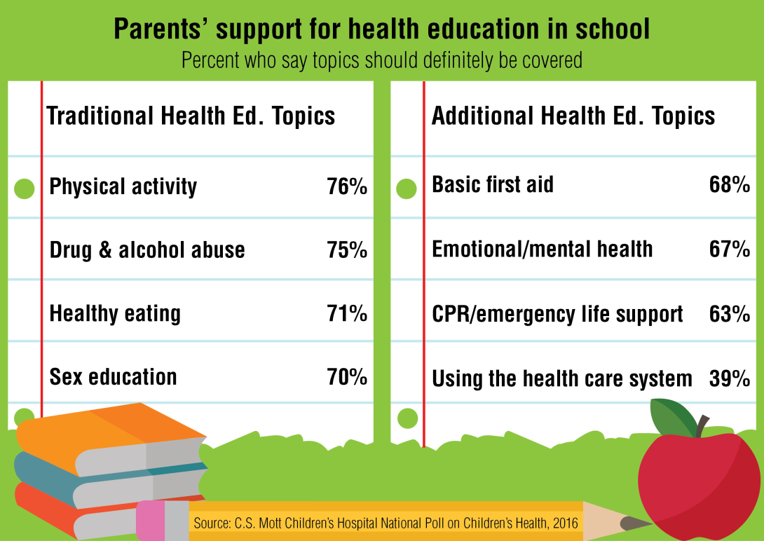 Parent perspectives reflect the trend, too, with more than two-thirds of parents polled saying traditional health topics should definitely be covered at their child's grade level, including physical activity, drug and alcohol abuse, healthy eating and sex education and pregnancy prevention. Most parents say these topics are currently taught at their school.