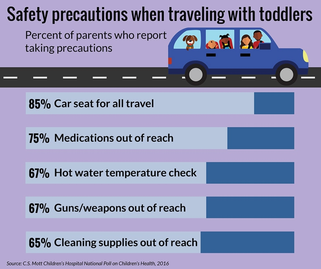 Meanwhile, three-quarters of parents remembered to safely store medications when traveling with toddlers, and two-thirds of parents checked to make sure cleaning supplies, guns and other weapons were out of the child's reach. Two-thirds also checked the hot water temperature wherever they were staying. Forty percent of parents reported taking all of these safety precautions — while 3 percent did none.