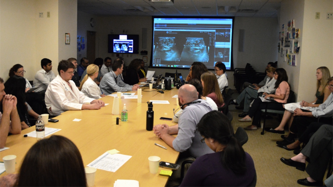 If it's noon on Wednesday, you'll find more than 40 people gathered around a long conference table and lining the walls of a conference room in the hospital.