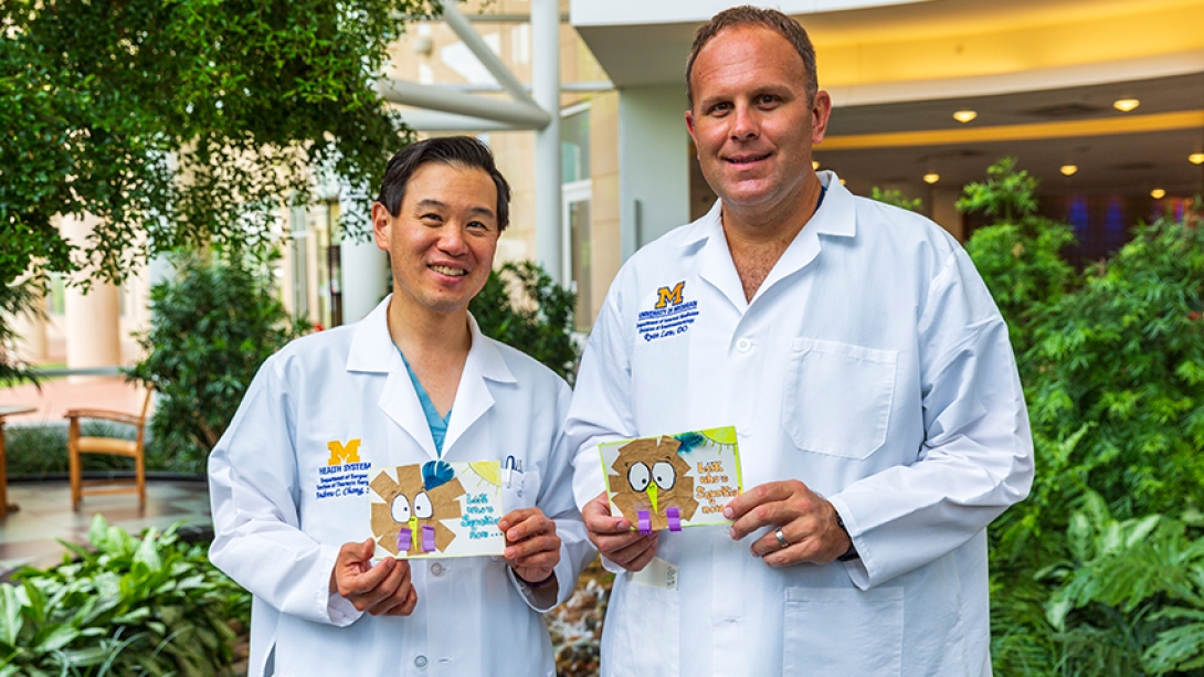 Andrew Chang, M.D., and Ryan Law, M.D., show off their homemade cards from Wils' wife, Pamela. She creates cards every week for her friends, family and customers. "The card was special because they saved John's life. We are so thankful," she says.