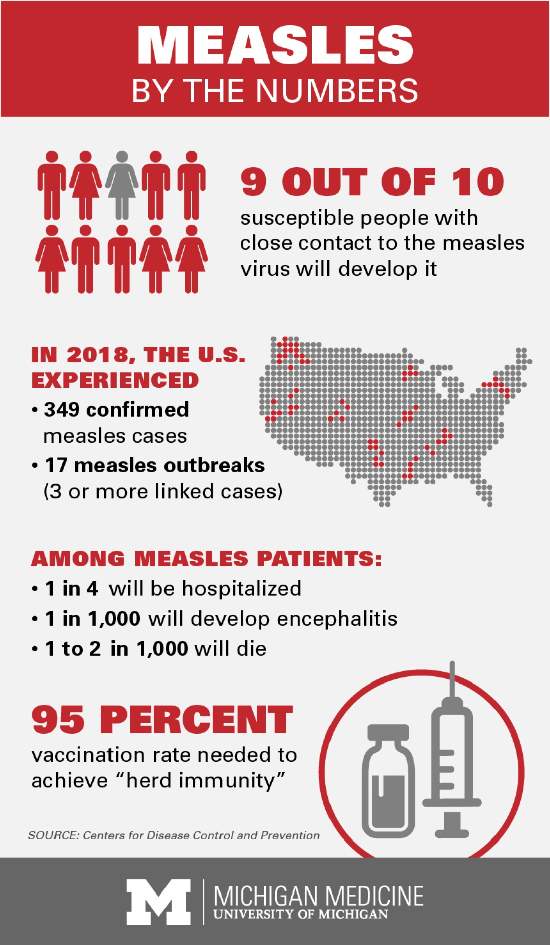 One or two of every 1,000 affected children will die from complications related to measles, the CDC reports.